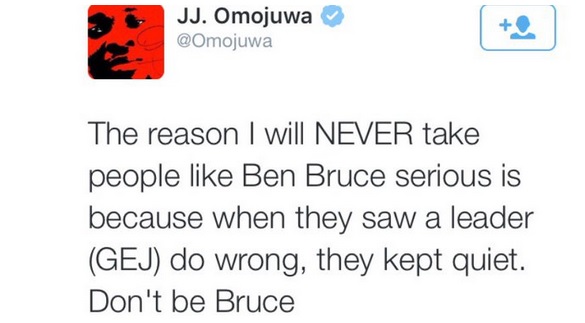 The twitter fight which went viral, was set off by a tweet posted by Japhet Omojuwa, who tweeted that Ben Bruce should not be taken seriously. “The reason I will NEVER take people like Ben Bruce serious is because when they saw a leader (GEJ) do wrong, they kept quiet. Don’t be Bruce,” he said.