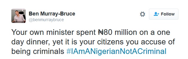 While condemning the president’s comments, Ben Bruce wrote on his twitter,“Your own minister spent ₦80 million on a one day dinner, yet it is your citizens you accuse of being criminals #IAmANigerianNotACriminal.”