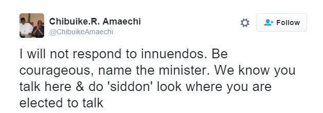The Minister of Transport reacted by accusing the Bayelsa Senator of only finding his voice on twitter while he is hardly seen contributing to debates in the Senate. “I will not respond to innuendos. Be courageous, name the minister. We know you talk here & do ‘siddon’ look where you are elected to talk,” he said.